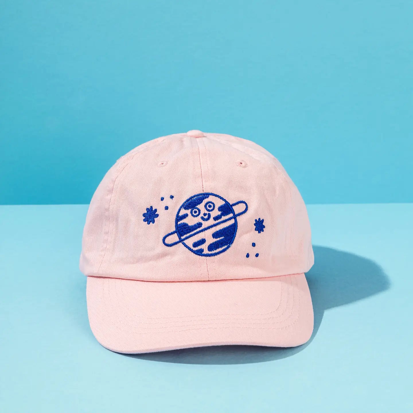 Esta gorra de papá, suave y rosa claro, presenta una divertida ilustración de Playful Planet, rodeada de brillantes estrellas azules. El bordado, elaborado con esmero por una empresa local de Oporto, le aporta un toque artesanal único a cada pieza.