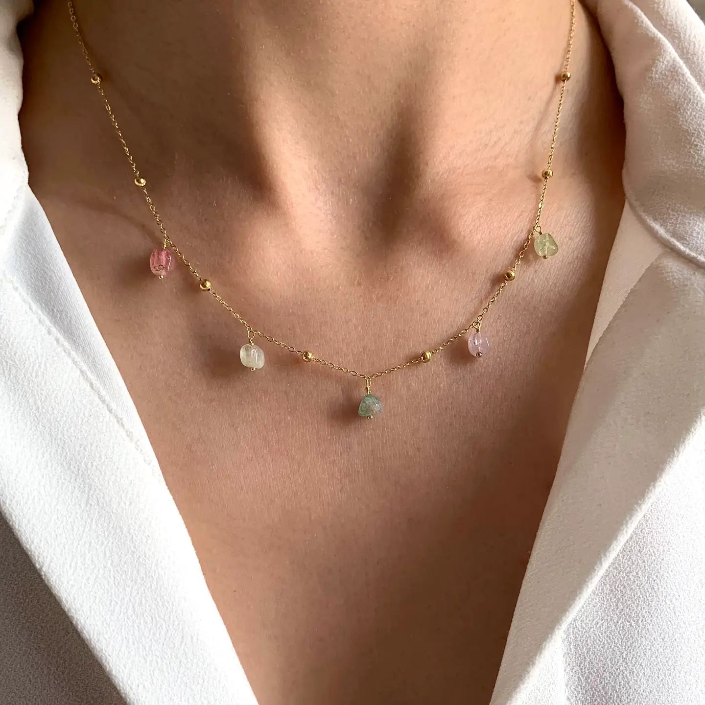 Un delicado collar diseñado para ajustarse al cuello, con cuentas de turmalina natural y una elegante cadena de acero inoxidable. Minimalista y elegante, añade un toque sutil y natural a tus looks de diario.