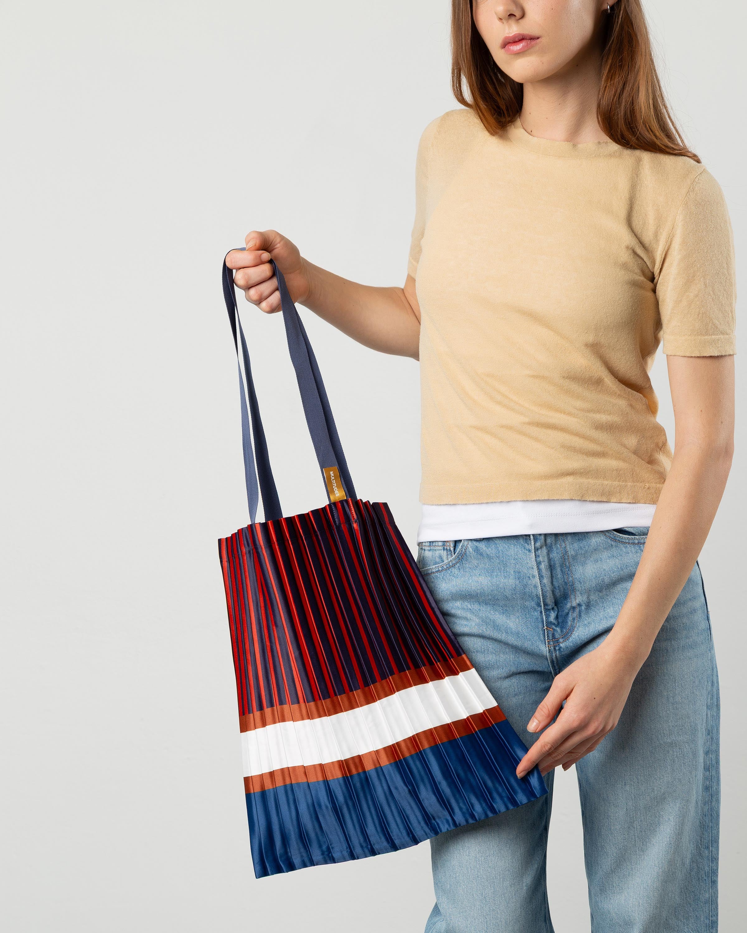 The Chiavari satin pleated tote is designed for every season and every outfit—elegant or urban, day or night. Its luminous pleats naturally match all colors, making it the one bag you can truly wear with everything.