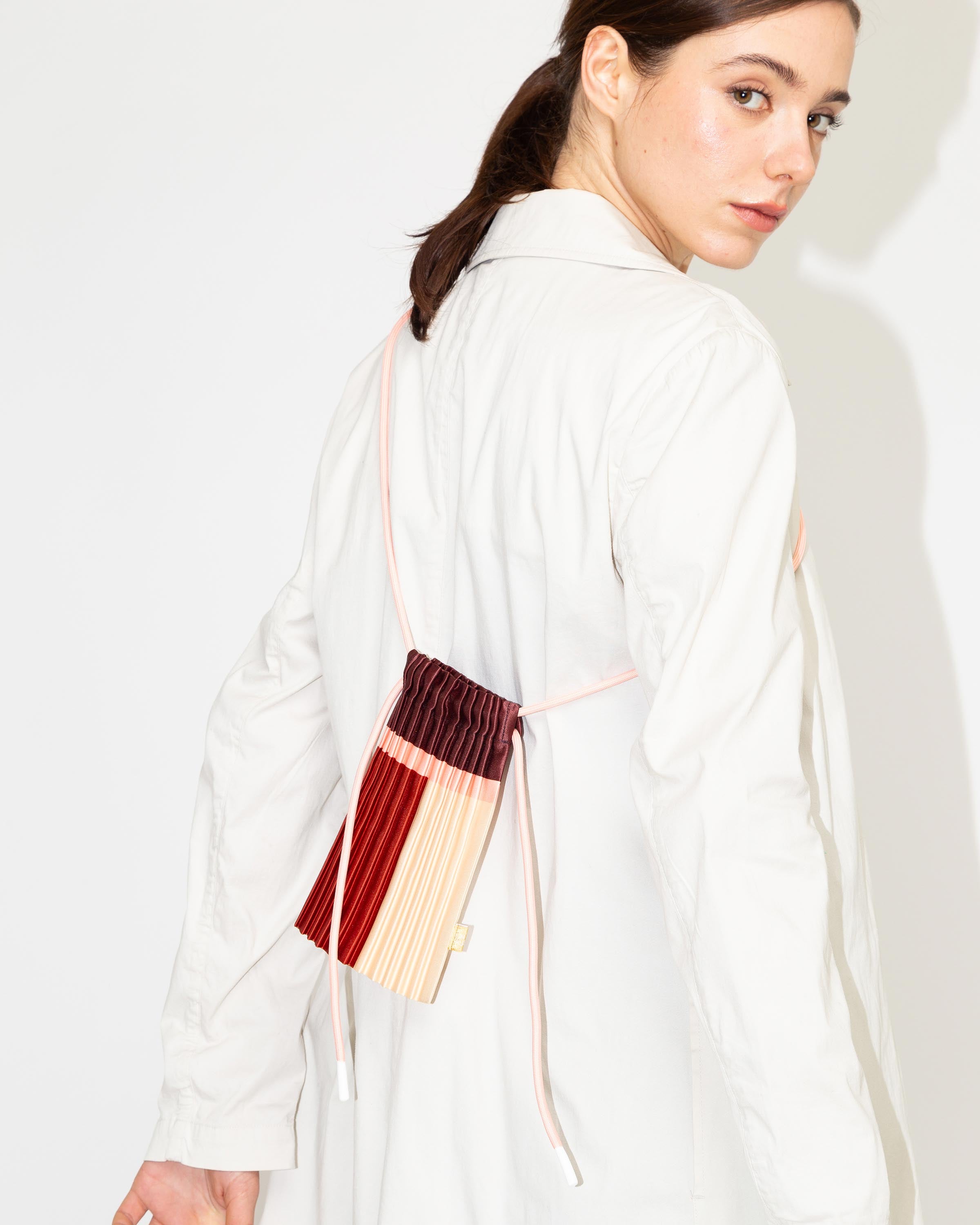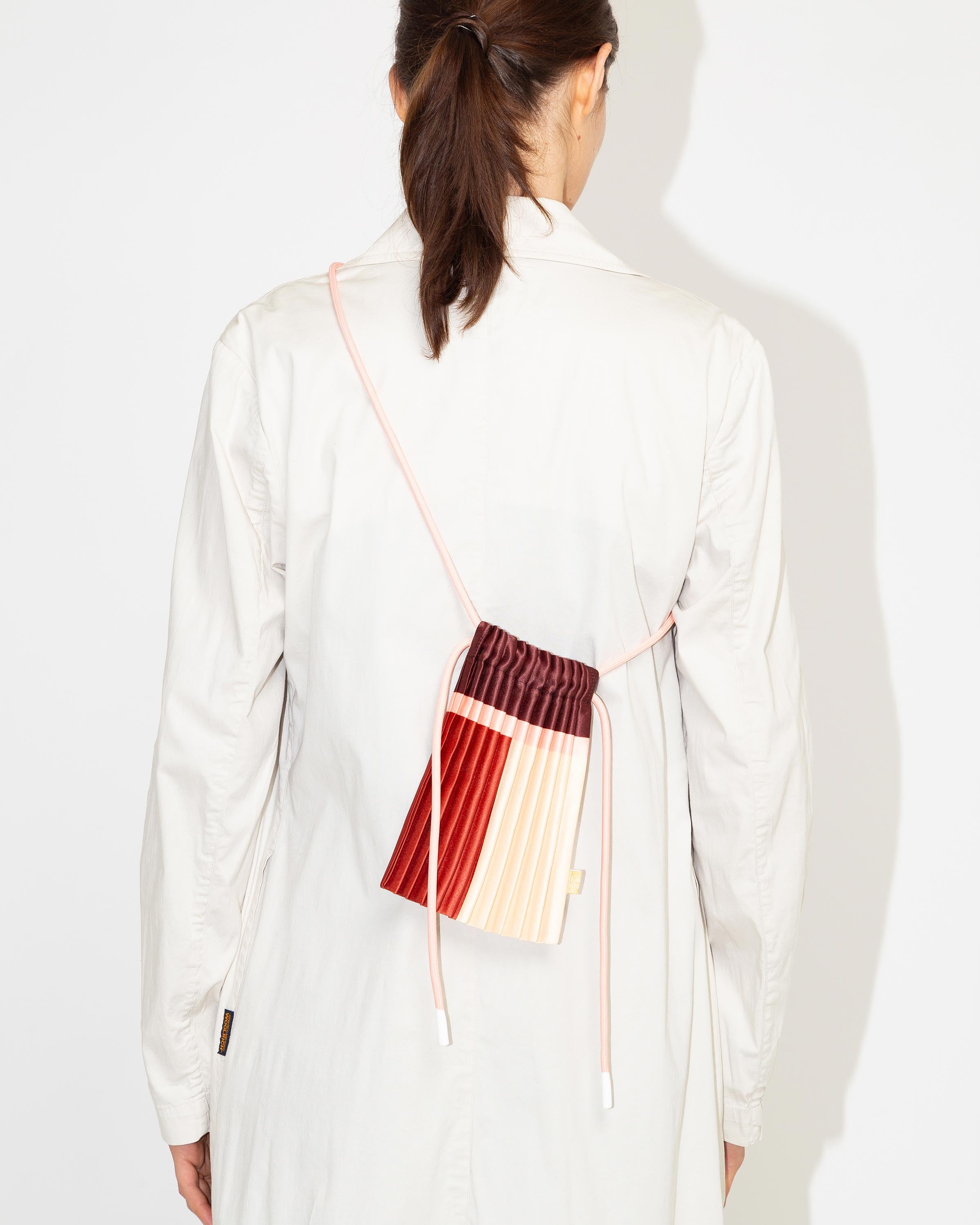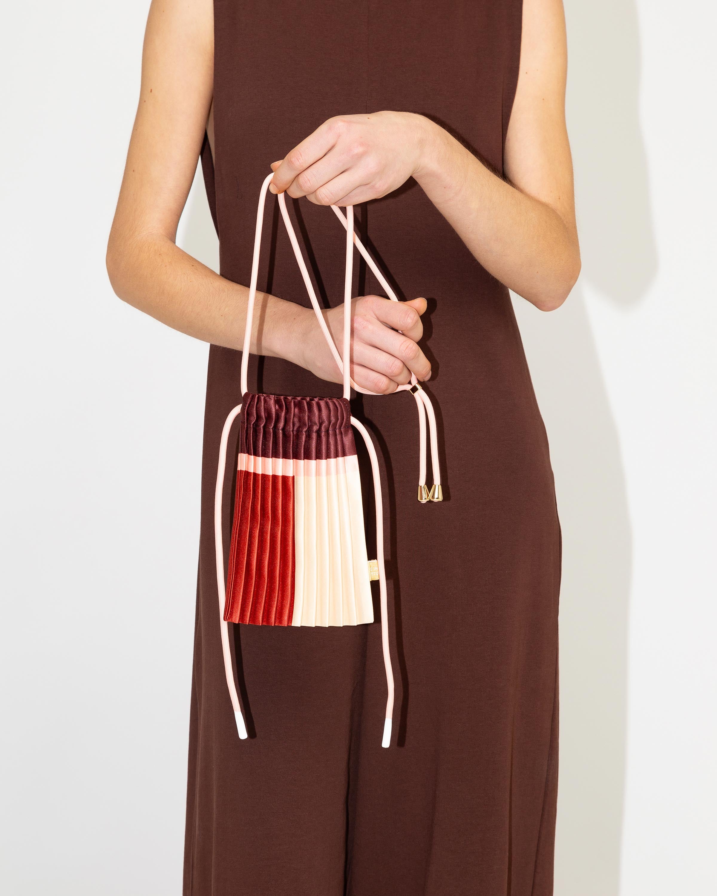 The satin pleated mini bag moves effortlessly with any outfit, from urban casual to polished looks. Pleats allow it to expand, fitting not just your phone but also your wallet, keys, and essentials (14 × 20 cm closed, up to 20 × 20 cm open).